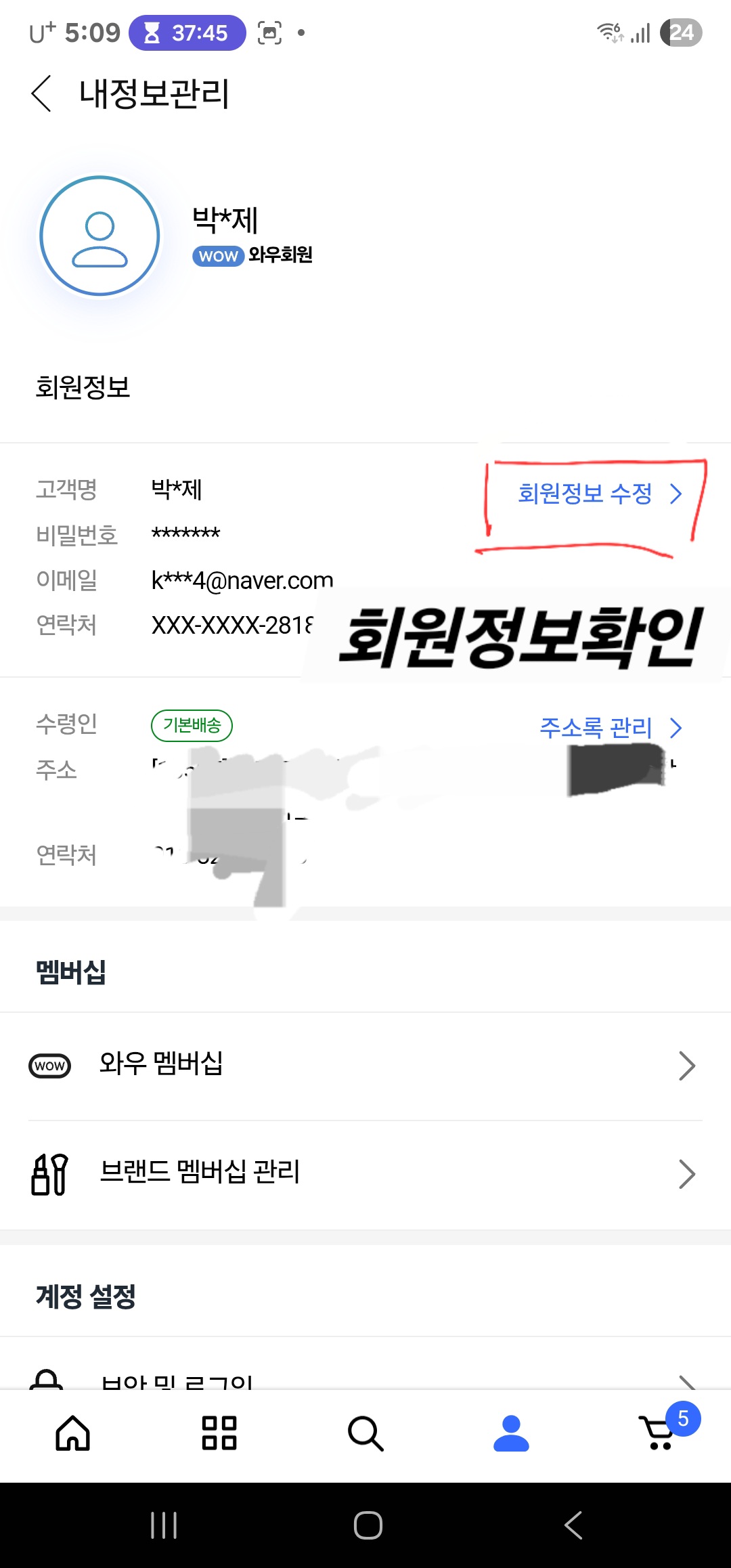 - 확인 방법: 쿠팡(쇼핑) 앱 켜기 -> 마이쿠팡 -> 내 정보 관리